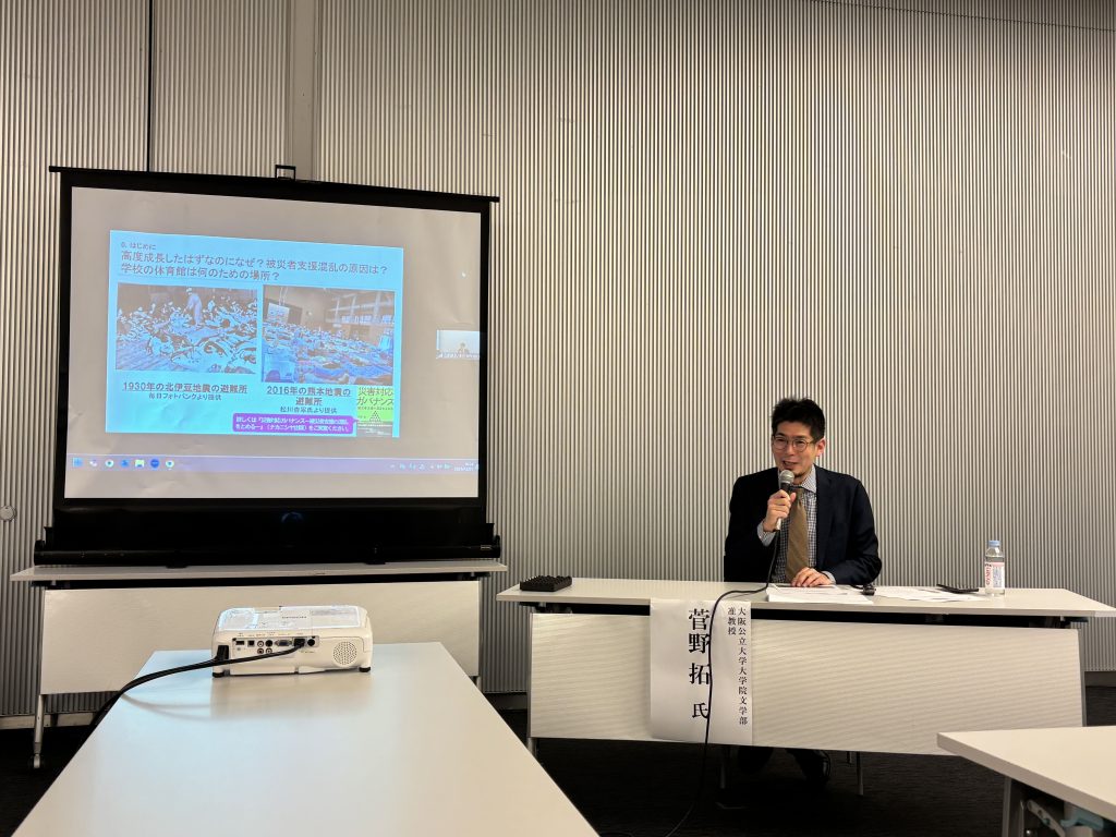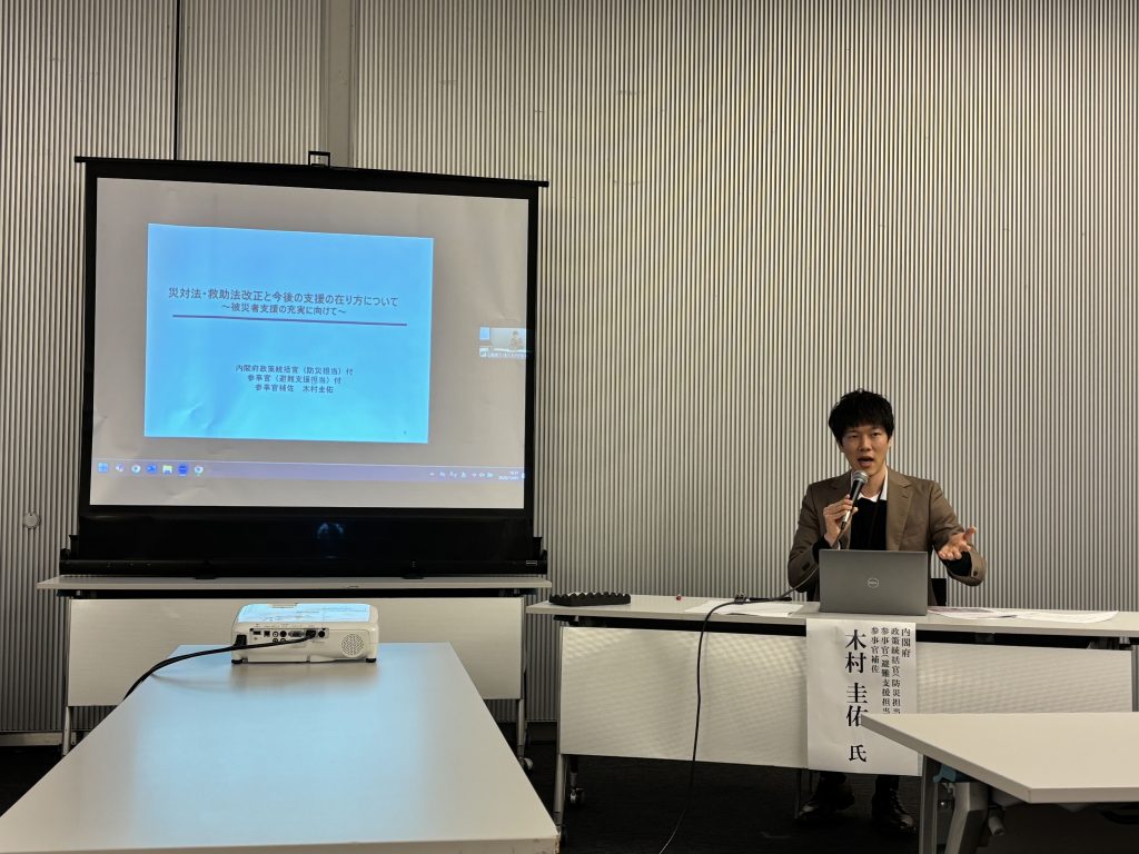 講師には、大阪公立大学大学院の菅野拓氏と、内閣府(防災担当)の木村圭佑氏をお迎えし、それぞれ専門的な立場から法改正の狙いと今後の支援の方向性についてお話しいただきました。菅野氏からは、これまでの制度が抱えていた課題や、今回の法改正が必要とされた背景について歴史的な経緯も交えた説明がありました。続いて、木村氏からは、制度の具体的な改定内容や、自治体・支援団体が今後準備すべきポイントについて、制度運用の視点から、実務上の要点を整理した説明が示されました。参加者からは「制度の全体像がようやく理解できた」「福祉的支援を現場でどう展開するか考える重要な機会になった」といった声が寄せられました。